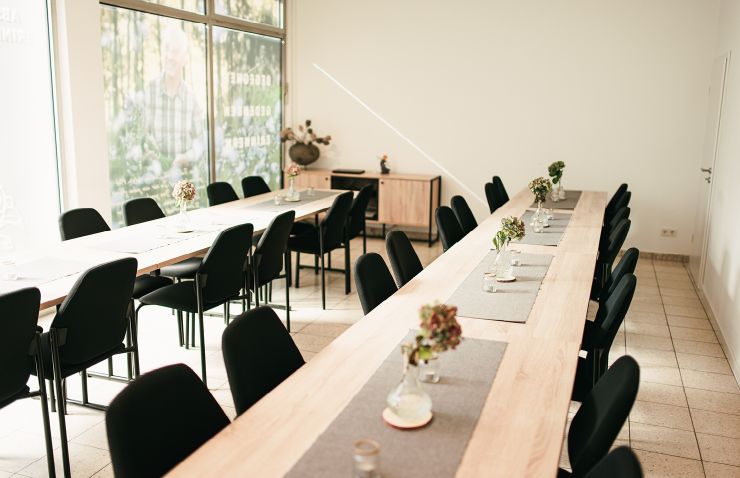 Ja, im Haus Vergissmeinnicht gibt es Platz für bis zu 50 Personen und dementsprechend ist die Location mit Tischen und Stühlen ausgestattet. Sie können die Location mit oder ohne Bestuhlung mieten und die Tische und Stühle im Vorfeld individuell stellen.